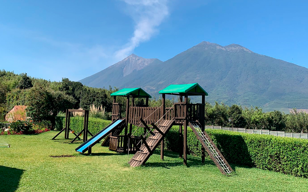 Área de juegos infantiles con bellas vistas a los volcanes y area de mesas.